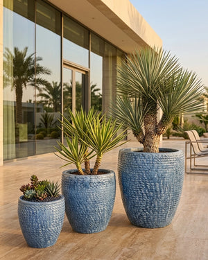 The blue glaze naturally suits poolside terraces, coastal-inspired interiors, and Mediterranean-style courtyards. Use the largest size as a standalone floor feature or group the smaller two on a stepped plant stand for a layered display.