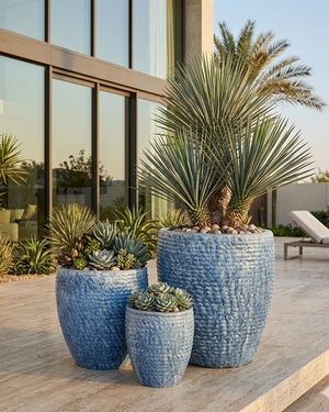 The same popular rope-textured ceramic, now in a vivid blue that brings coastal energy to covered terraces, poolside areas, and bright indoor spaces. Three generous sizes let you go from accent piece to focal point.